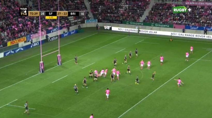 Le match ne peut pas plus commencer pour Brive. Danty et Waisea font parler leur puissance et mettent le Stade Français dans l'avancée. Jules Plisson lit la défense et s'engouffre dans un espace pour inscrire le premier essai de la rencontre (7-0, 2'). Brive parvient à mettre la main sur la balle et tente de réagir mais la défense est bien en place. Bien en place mais parfois à la faute dans le jeu au sol. Thomas Laranjeira en profite pour ouvrir le compteur côté briviste (7-3, 8'). Les deux équipes ne ferment pas le jeu mais font quelques fautes de main. Le Stade Français est cependant plus incisif dans ses attaques et se retrouve régulièrement dans le camp et les 22 brivistes. Paris avance et trouve des espaces sur les extérieurs. Sergio Parisse joue le 2 contre 1 pour lui même et inscrit le 2e essai de son équipe (12-3, 13'). Le CAB revient dans le camp parisien et obtient une pénalité. Laranjeira marque 3 points de plus (12-6, 17'). Le Stade Français est tout proche d'un nouvel essai mais Camara a le pied en touche, l'essai de Daguin est donc refusé à la vidéo (18'). Les vagues roses déferlent sur la défense briviste qui résiste comme elle peut. Ensor pense marquer l'essai mais il a mis le pied en touche et l'arbitre revient à une faute précédente. Plisson ajoute 3 points de plus (15-6, 25'). On se rend coup pour coup. Sisa Koyamaibole avance en puissance et rentre dans les 22. On se met à la faute dans un ruck. Laranjeira continue son sans faute (15-9, 28').