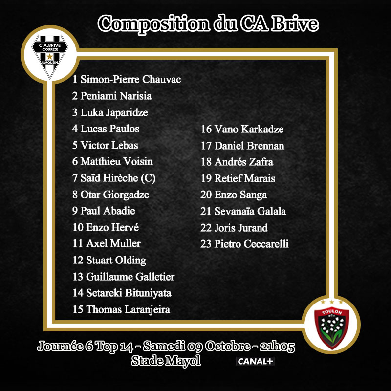 Voici le XV de départ du CA Brive pour le déplacement à Toulon :