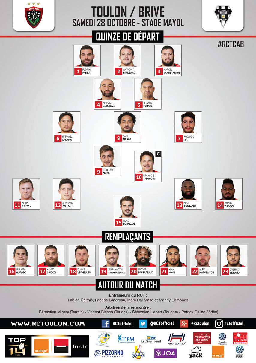Toulon cherche de la régularité en ce début de saison car actuellement difficile de juger sur la durée ce RCT, capable de fulgurances mais aussi de gros trous d'air. Face à Brive, les toulonnais veulent montrer un beau visage.