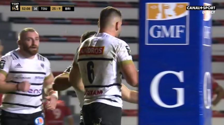 Toulon veut continuer sur son temps fort de la fin de la première période et s'installe dans les 22 mètres brivistes. Les avants varois insistent dans l'axe mais la défense tient. Elle tient mais elle est hors-jeu. Carbonel passe une nouvelle pénalité (25-9, 45'). Brive a du mal à percer, à trouver des décalages dans les zones dangereuses. Il faut souvent tenter de partir de très loin et ça marche. Abzhandadze feinte et sert Brandon Nansen dans l'espace sur la ligne médiane. Joris Jurand et Axel Muller combinent pour arriver dans les 22 mètres, le ballon sort rapidement et Otar Giorgadze casse le plaquage du défenseur toulonnais pour aller aplatir sous les poteaux (25-16, 53').
