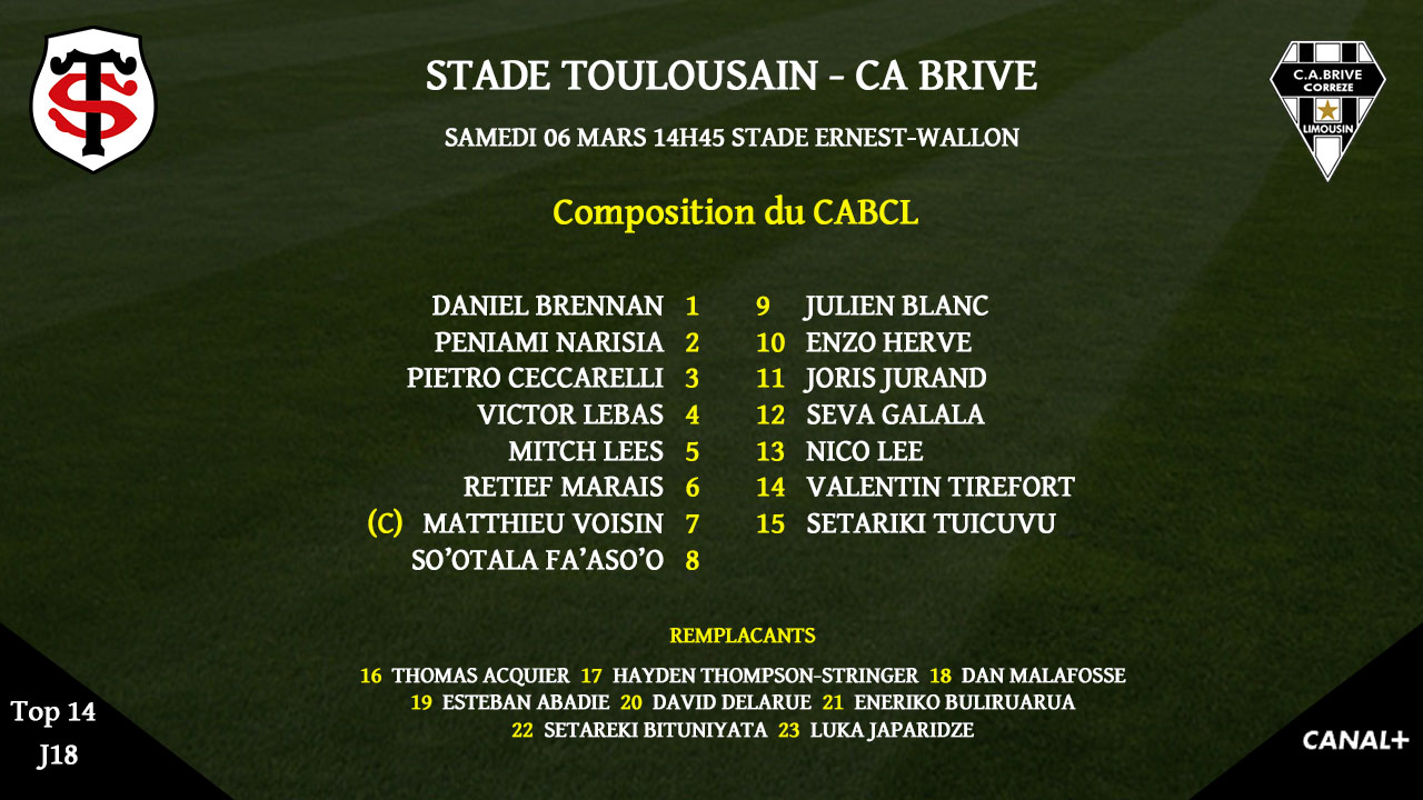Voici le XV de départ du CA Brive pour le déplacement à Toulouse :