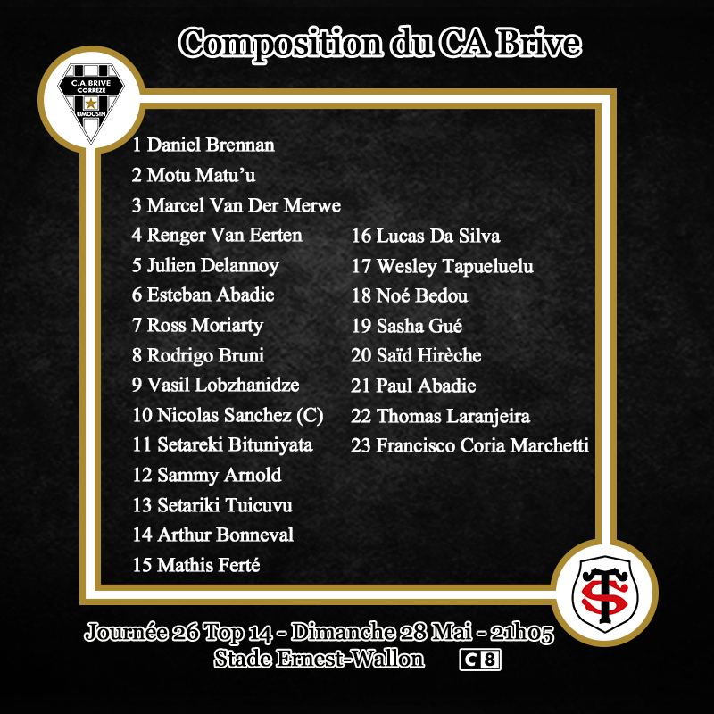 Voici le XV de départ du CA Brive pour le déplacement à Toulouse :