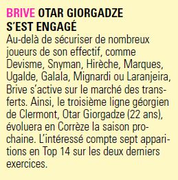 Selon Midi Olympique, Brive serait sur le point de signer le 3e ligne espoir de Clermont Otar Giorgadze (22 ans, 1m93, 108 kg).