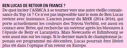 Ce vendredi, Midi Olympique annonce que Brive serait en contact avec l'australien Ben Lucas (29 ans, 1m78, 81kg):