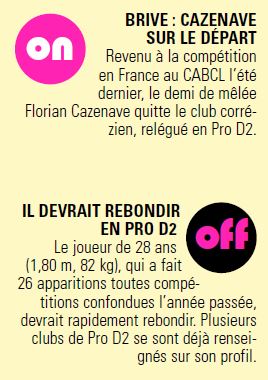 Selon Midi Olympique, Cazenave ne sera pas conservé au CAB mais pourrait rejoindre une autre équipe de Pro D2 et donc retrouver Brive.