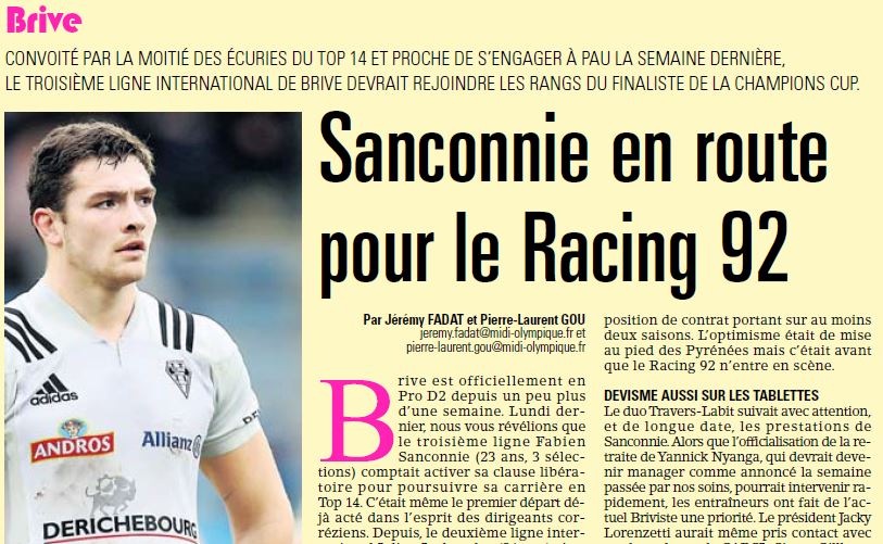 Selon Midi Olympique, Clermont, Lyon, La Rochelle et Pau se sont manisfestés mais il semble bien que ce soit le Racing 92 qui va remporter la mise sur le 3e ligne briviste.