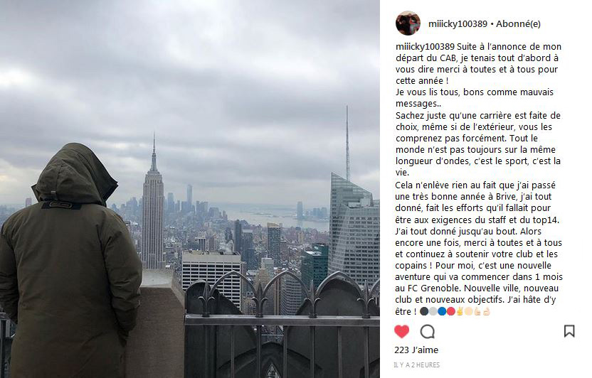 Après Gaëtan Germain, voici qu'un deuxième briviste va rejoindre les rangs du promu grenoblois. Si on pensait qu'il allait rester au CAB, finalement, il va privilégier le fait de rester en Top 14. Son premier choix était de rester à Brive mais les discussions ne sont pas passées comme il le souhaitait.