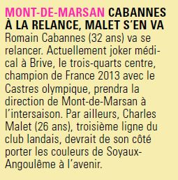 [Mise à jour 02/05/17] Mont de Marsan a officialisé le retour au club de Romain Cabannes. Le contrat est de 2 ans.